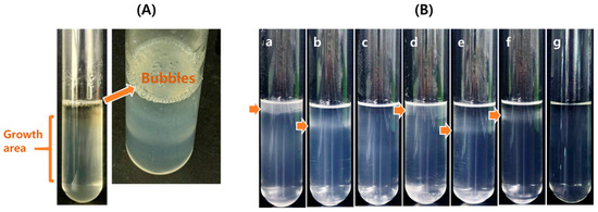 Genome-based in silico analyses revealed that the strains S. rosea M1T and S. mucosa 8-14-6T, but not strain TT6T, possess the genes required to catalyze the denitrification of nitrate (NO₃−) to dinitrogen (N2). This process proceeds through a series of sequential reactions involving the intermediate nitrite (NO2−), nitric oxide (NO), and nitrous oxide (N2O) formation, catalyzed by the enzymes nitrate reductase (encoded by narGHI and napAB), nitrite reductase (nirS), nitric oxide reductase (norBC), and nitrous oxide reductase (nosZ), respectively (Figure 6) [43]. Notably, these strains encode two distinct types of dissimilatory nitrate reductase: the cytoplasmic membrane-associated NarGHI, and the periplasmic NapAB [44]. This genomic analysis suggests that S. rosea M1T and S. mucosa 8-14-6T have the potential for anaerobic respiration utilizing nitrate as an electron acceptor. The genes involved in these sequential denitrification reactions are illustrated in Figure 6. When denitrification activity was tested using the API 20 NE system, S. rosea M1T and S. mucosa 8-14-6T tested positive, whereas strain TT6T tested negative. Further examination of denitrification activity was conducted in test tubes as described in the Materials and Methods. Strain TT6T exhibited growth restricted to the upper 0.9 mm of the medium. In contrast, S. rosea M1T showed growth extending below this depth, accompanied by bubble formation (Figure 7A). These observations indicate that strains TT6T and S. rosea M1T preferentially utilize O2 and NO₃− as electron acceptors under the tested conditions. Moreover, putative genes (nxrAB) encoding enzymes responsible for the oxidation of nitrite to nitrate, which are typically associated with chemolithoautotrophic nitrite-oxidizing bacteria [45], were identified in S. rosea M1T not in strain TT6T (Figure 6).