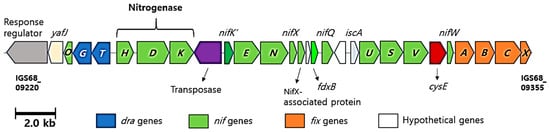Notably, the genomes of TT6T and S. rosea M1T were found to contain genes (nifDKH) encoding Mo-nitrogenase [46], an enzyme responsible for catalyzing the conversion of N2 to NH3, known as nitrogen fixation. In contrast, these genes were absent in the genome of S. mucosa 8-14-6T. The nitrogenase-encoded genes were also identified in S. pratensis W17T, S. aerolata 5416T-32T, and S. stibiiresistens SB22T [47]. In strain TT6T, a gene cluster spanning approximately 25.5 kb (from IGS68_09220 to IGS68_09355) was identified, encoding nitrogenase, nitrogenase assembly, and accessory proteins (Figure 8). The deduced gene products corresponding to each gene locus within the gene cluster are summarized in Table S3. The Skermanella nitrogenase genes share the highest sequence homology with those in genus Azospirillum, a genus known for nitrogen-fixing and its role in promoting plant growth.