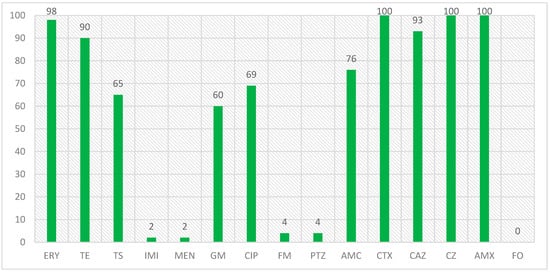 Antibiotic resistance percentage in isolates with blaCTX-M1 gene.