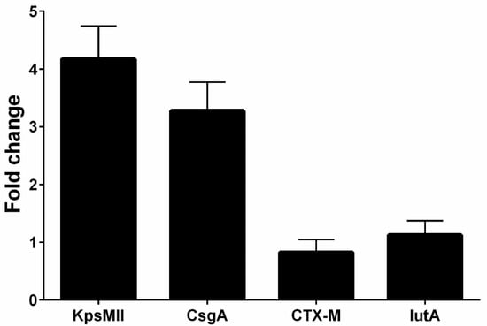 The fold change of the genes (blaCTX-M1, KPSMII, CsgA and IutA) in real-time PCR.