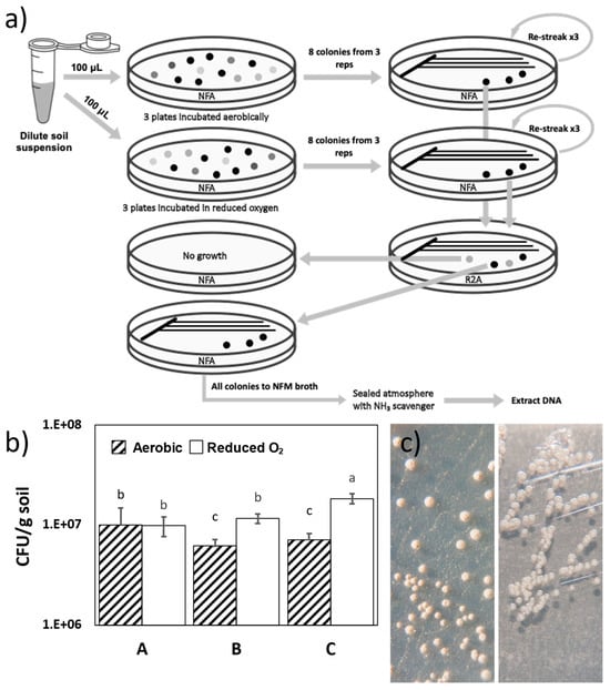 Diversity of isolates obtained on NFA incubated aerobically or under reduced oxygen conditions; (a) flow chart illustrating the isolation and processing of putative nitrogen-fixing bacteria from Sioux Prairie soil samples; (b) culturable counts on NFA incubated under aerobic and reduced oxygen conditions at 28 °C for 14 d, with letters indicating significant differences as determined by Duncan’s new multiple range test; and (c) colony characteristics of an isolate on R2A (left) and NFA (right).