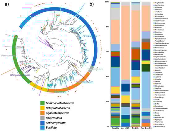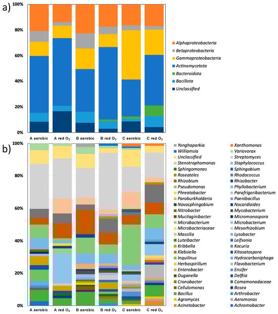 The V1-V3 16S rRNA gene sequences were evaluated for sequence quality using RDPII, which yielded 471 partial 16S rRNA sequences. These 471 sequences were classified using the SILVA database with an 80% cutoff parameter. Of these, 93% (442) were classified as bacteria, and the remainder had a similarity percentage of less than 80%, so they were labeled unclassified. All 442 classified isolates belonged to one of four phyla: Actinomycetota (previously Actinobacteria) (198, 42%), Pseudomonadota (previously Proteobacteria) (207, 43%), Bacillota (previously Firmicutes) (28, 6%), and Bacteroidota (previously Bacteroidetes) (9, 2%). The Pseudomonas isolates included Alphaproteobacteria (87, 18%), Gammaproteobacteria (91, 19%), and Betaproteobacteria (29, 6%) (Figure 2a). The isolates were distributed across three different transects with some variation. Actinomycetota were dominant in transect A, but Gammaproteobacteria were more abundant in transect C. Additionally, Bacteroidota were absent in transect A. Of the 58 genera detected, Bacillus, Bosea, Kitasatospora, Kribbella, Mesorhizobium, Microbacterium, Nocardioides, Phyllobacterium, Pseudomonas, Rhizobium, Rhodococcus, Stenotrophomonas, Streptomyces, and Variovorax were present in all three transects (Figure 2b). Of the 58 genera, 24 grew under both aerobic and oxygen-limiting conditions, the most abundant of which were Streptomyces, Pseudomonas, Rhizobium, Rhodococcus, Stenotrophomonas, Phyllobacterium, Microbacterium, and Bacillus (Figure 2b). Nineteen genera were obtained under aerobic incubation conditions only, and fourteen genera were unique to reduced oxygen conditions (Table 2).