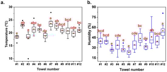 Temperatures (a) and humidity (b) in the kitchen of 12 volunteers over 10 weeks. The squares and diamonds represent the mean values and outliers, respectively. The letters above the bars indicate the results of group comparisons based on a one-way ANOVA test. The same letters indicate no significant difference (p > 0.05), while different letters indicate a significant difference (p > 0.05).