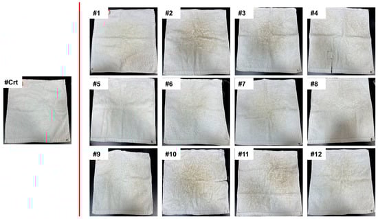 As shown in Figure 2, all used towels turned yellow, a change which could be detected by the naked eye. A reflectance spectrophotometer was employed to evaluate the color change of the towels quantitatively. The average whiteness index (WI) of the control towels was 97.72, indicating a near-standard white color. However, after being used for ten weeks, the WI values of all towels decreased significantly (Figure 3a, p < 0.05). Towel #10 demonstrated the lowest WI of 3.69, implying the highest level of dullness, which was consistent with the naked-eye observation results. In addition, towels #5, #6, and #8 displayed high WI values, indicating relatively low dullness levels.