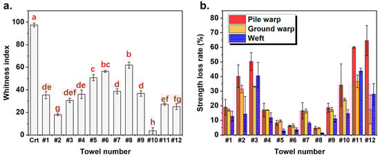 (a) Whiteness index of the new towel and 10-week used towels (The letters above the bars indicate the results of group comparisons based on a one-way ANOVA test. The same letters indicate no significant difference (p > 0.05), while different letters indicate a significant difference (p > 0.05). (b) Strength loss rates of pile warp, ground warp, and weft of 10-week used towels compared to those of the new towel.