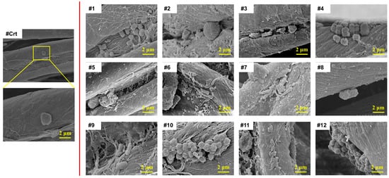 The morphology of towels was observed via SEM imaging. As shown in Figure 4, new towels showed little evidence of bacterial colonization, except for occasional small patches of individual bacterial cells without EPSs. In sharp contrast, all 12 used towels displayed significantly greater densities of microorganisms than the control towel. Various microcolony morphologies could be found on the same piece of towel, suggesting the presence of different microorganism species. Most of the microorganisms were located in the gaps between cotton fibers and grooves of kidney-shaped cotton fibers, which were difficult to rinse off with water. In addition, all used towels demonstrated the presence of EPSs around the microorganisms, indicating biofilm development. Microbial adhesion to the towels seems to be associated with the confirmed color changes. For example, minimal microbial adhesion and EPS-like substances were found on towel #8, which displayed the whitest color with a WI of 62.91. However, for towel #10, considered the dirtiest towel with the smallest WI of 3.69, a large number of adhered microorganisms appeared not only in the gaps between cotton fibers but also on the relatively smooth fiber surface. These SEM results confirmed that microbial colonization and further production of EPSs are important indicators for the assessment of towel cleanliness during daily usage.