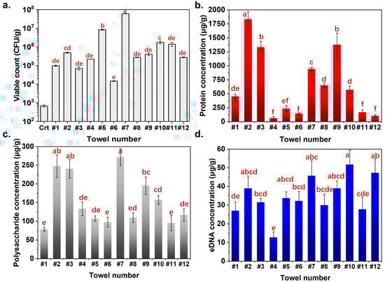 (a) Bacterial population of control and 10-week used towels. (b) Protein concentrations, (c) polysaccharide concentrations, and (d) eDNA concentrations in the biofilm of 10-week used towels. The letters above the bars indicate the results of group comparisons based on a one-way ANOVA test. The same letters indicate no significant difference (p > 0.05), while different letters indicate a significant difference (p > 0.05).