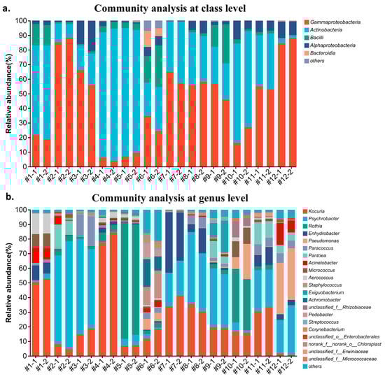 Figure 6a,b display the complexity of the bacterial community on towels at class and genus levels, respectively. The bar plots show the relative abundance of each class or genus, with different colors representing bacterial groups and the bar height indicating their abundance in each sample. The disparity in the microbial composition between the two parallel samples is minimal, proving the reliability of the HTS result. Actinobacteria was the most dominant class on towels #1, #4, #5, and #10. However, the dominant class was identified as Gamma-proteobacteria for towels #2, #3, #7, #8, #9, #11, and #12. Specifically, towel #6, with the lowest bacterial contamination level, contained three major bacterial classes (Actinobacteria: 29.49%, Gamma-proteobacteria: 26.46%, and Bacilli: 23.30%), displaying the richest bacterial diversity at the class level. Another study of microbial populations on daily towels found Gamma-proteobacteria, Actinobacteria, and Alpha-proteobacteria to be the predominant bacterial classes, but no Bacilli could be detected []. This difference suggests that the high relative abundance of Bacilli might be related to the kitchen environment in which the towels were used in this study. Several studies confirm this hypothesis. One study identified 113 Bacillus isolates from kitchen roll samples, while another study detected Bacillus spp. in food residues from kitchens [,]. Bacillus species are commonly introduced into kitchens through protein- or starch-rich foods. Their spores are highly heat-resistant, enabling them to survive high temperatures and even endure some cooking processes. Moreover, the warm, humid conditions in kitchens promote the germination and growth of these spores, making it likely to detect Bacillus on kitchen towels.