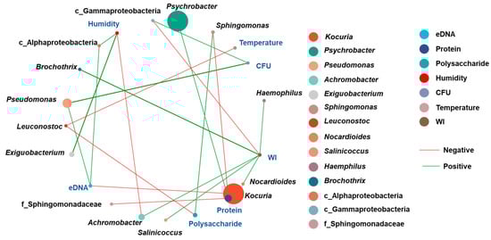 Network analysis of bacterial genus, environmental factors, whiteness index, and biofilm components. Red and green lines indicate negative and positive correlations, respectively.