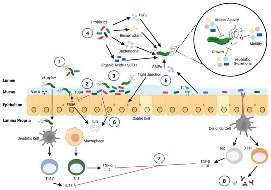 Proposed mechanisms of H. pylori inhibition by probiotics. (1) Prevention of H. pylori colonization by co-aggregation. (2) Adhesion to receptor sites on gastric epithelial cells (competitive exclusion). (3) Disruption/destruction of biofilm. (4) Production of organic acids that disrupt urease activity, as well as other antibacterial substances (hydrogen peroxide, bacteriocins, biosurfactants), and induction of antimicrobial peptide production by epithelial cells. (5) Stimulation of mucin synthesis, which contributes to the protection of tissues, and production of short-chain fatty acids (SCFAs), which strengthen tight junctions and support gastrointestinal barrier integrity. (6) Inhibition of IL-8 production, including through the alteration of CagA delivery to host cells by H. pylori. (7) Modulation of pro- (e.g., TNF-α) and anti-inflammatory (e.g., IL-10) cytokines, resulting in reduced inflammation. (8) increased production of immunoglobulin A (IgA). AMPs: antimicrobial peptides; CagA: cytotoxin-associated gene A; H2O2: hydrogen peroxide; IL: interleukin; SCFAs: short-chain fatty acids; TGF-β: transforming growth factor beta; Th: helper T cell; TLRs: toll like receptors; TNF-α: tumor necrosis factor alpha; Treg: regulatory T cell; TSS4: type IV secretion system; Vac A: vacuolating cytotoxin A. Created with BioRender.com.