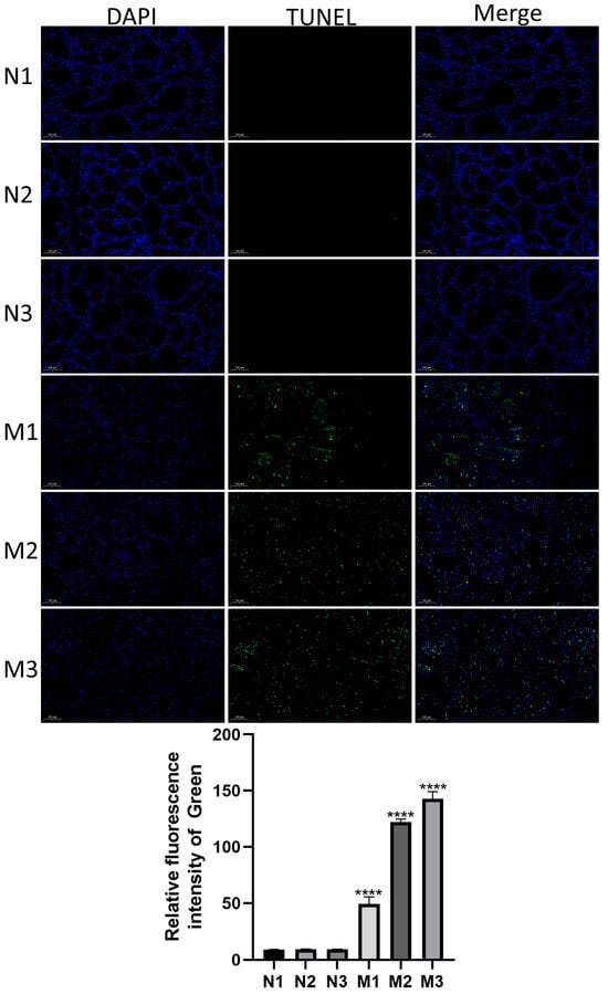 To assess apoptosis levels in bovine mammary tissues during mastitis, TUNEL staining was performed on samples from the healthy (Normal) and mastitic (Mastitis) groups. As illustrated in Figure 2, a significant increase in apoptotic cells was observed in the Mastitis group (M1, M2, M3) compared with the Normal group (N1, N2, N3) (p < 0.0001). These results suggest that E. coli-induced mastitis markedly elevated mammary epithelial cell apoptosis.
