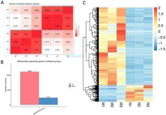 Correlation Evaluation and DEG Analysis between Samples. (A) shows the result of the Pearson correlation analysis. (B) presents a bar chart showing the quantities of up-regulated genes and down-regulated genes. (C) shows the hierarchical clustering analysis result of DEGs.