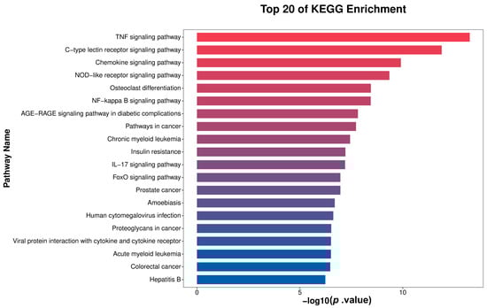 GO enrichment analysis further validated that the core functions of DEGs were centered on biological processes such as immune response, inflammatory response, signal transduction, and transcriptional regulation, particularly positive regulation of transcription by RNA polymerase II. KEGG pathway enrichment analysis mapped key signaling networks underlying mastitis pathogenesis. Among the top 20 significantly enriched pathways, many were directly related to immune inflammatory responses, including innate immune recognition and signaling pathways (e.g., the NOD-like receptor and C-type lectin receptor pathways), which are crucial for recognizing pathogen-associated molecular patterns (PAMPs, e.g., E. coli LPS, peptidoglycan) and DAMPs [22]. In this study, the enriched primary inflammatory signaling pathways among DEGs included the TNF signaling pathway, NF-κ B signaling pathway, and IL-17 signaling pathway. These pathways serve as central hubs orchestrating the production of pro-inflammatory cytokines (TNF-α, IL-1β, IL-17), amplifying inflammatory responses, and inducing downstream effector gene expression [23,24]. KEGG pathway analysis indicated significant enrichment in pathways related to chemotaxis and cell migration, such as the Chemokine signaling pathway, which directly regulates the recruitment of neutrophils and lymphocytes to the infection site. This agrees with the histologically observed cellular infiltration in this study [25].