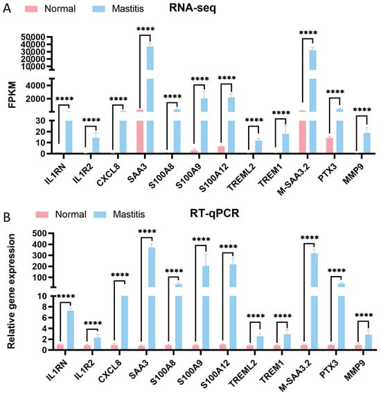 To validate the reliability of the RNA-seq results, genes associated with inflammation and immune regulation (S100A12, IL1RN, IL1R2, CXCL8, SAA3, S100A8, S100A9, TREML2, TREM1, M-SAA3.2, PTX3, and MMP9) were selected from the top 20 upregulated DEGs. RT-qPCR was used to assess their expression levels. As shown in Figure 6, compared to the Normal group, the expression of these genes was significantly elevated in the Mastitis group (p < 0.0001). This is consistent with the RNA-seq results, thereby confirming the robustness of the transcriptomic data and laying a solid foundation for subsequent research.
