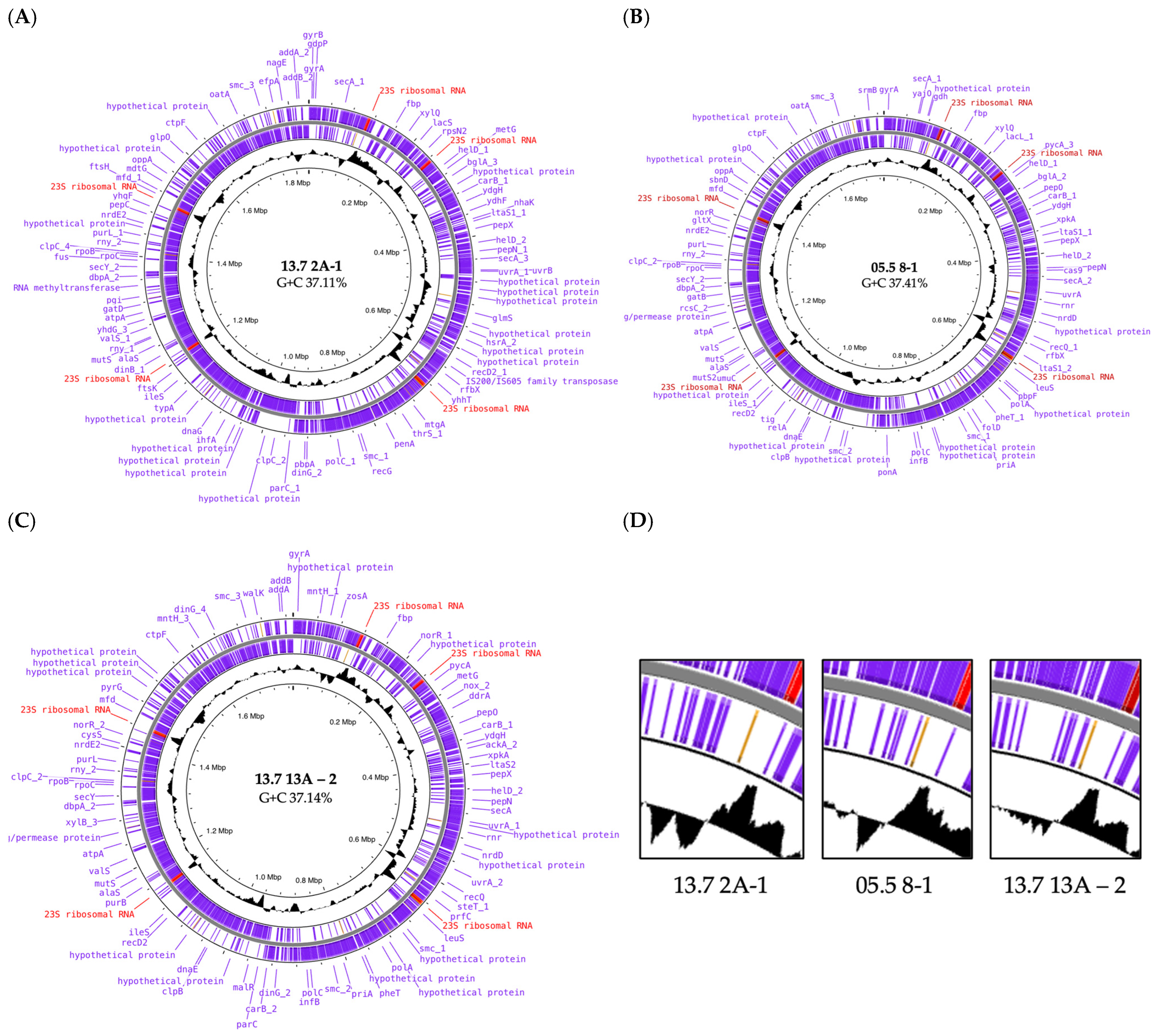 - Grant, J.R.; Enns, E.; Marinier, E.; Mandal, A.; Herman, E.K.; Chen, C.; Graham, M.; Van Domselaar, G.; Stothard, P. Proksee: In-Depth Characterization and Visualization of Bacterial Genomes. Nucleic Acids Res. 2023, 51, W484–W492. [Google Scholar] [CrossRef]
