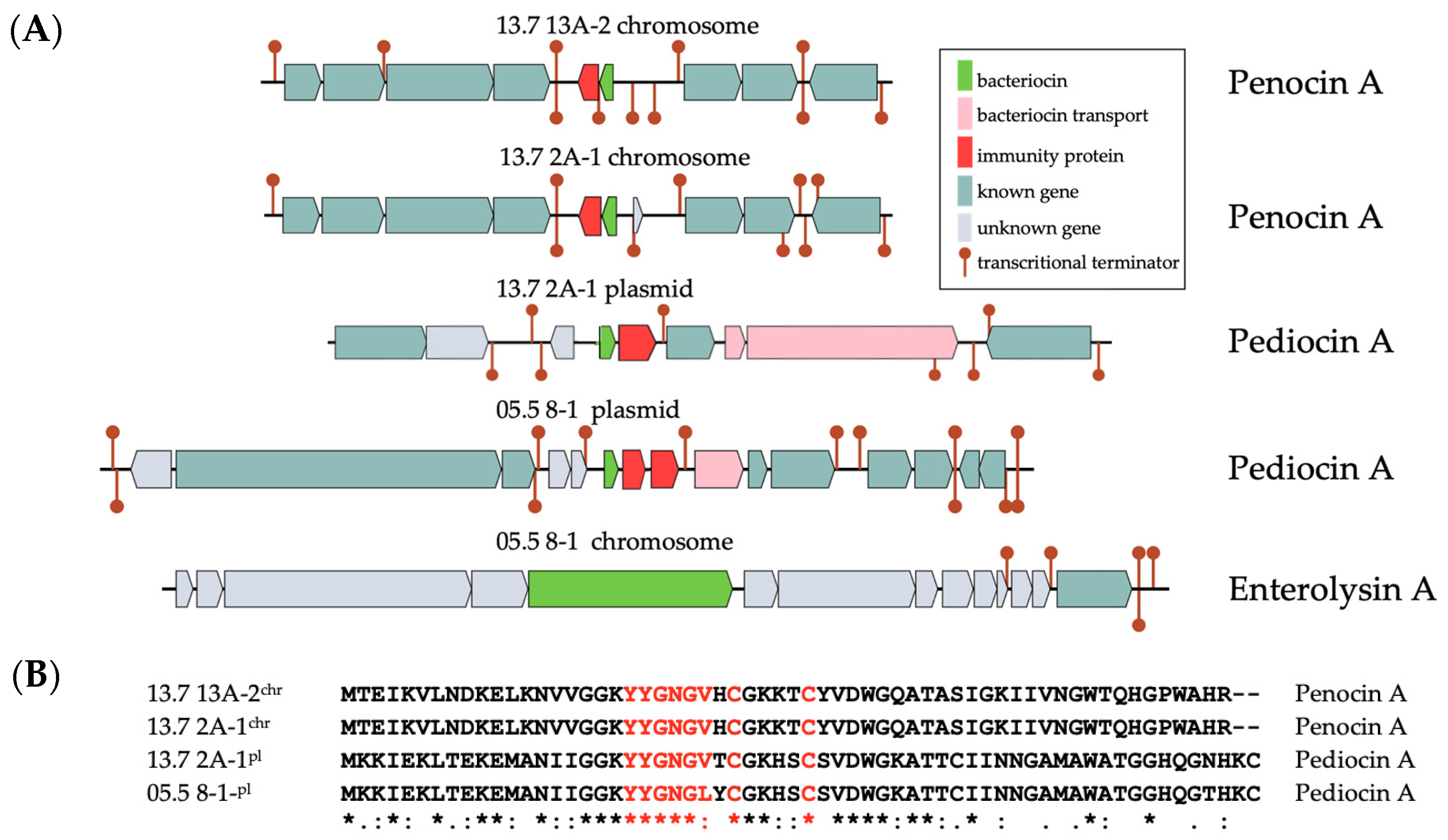 - Rodrigues Blanco, I.; José Luduverio Pizauro, L.; Victor Dos Anjos Almeida, J.; Miguel Nóbrega Mendonça, C.; De Mello Varani, A.; Pinheiro De Souza Oliveira, R. Pan-Genomic and Comparative Analysis of Pediococcus pentosaceus Focused on the in Silico Assessment of Pediocin-like Bacteriocins. Comput. Struct. Biotechnol. J. 2022, 20, 5595–5606. [Google Scholar] [CrossRef]