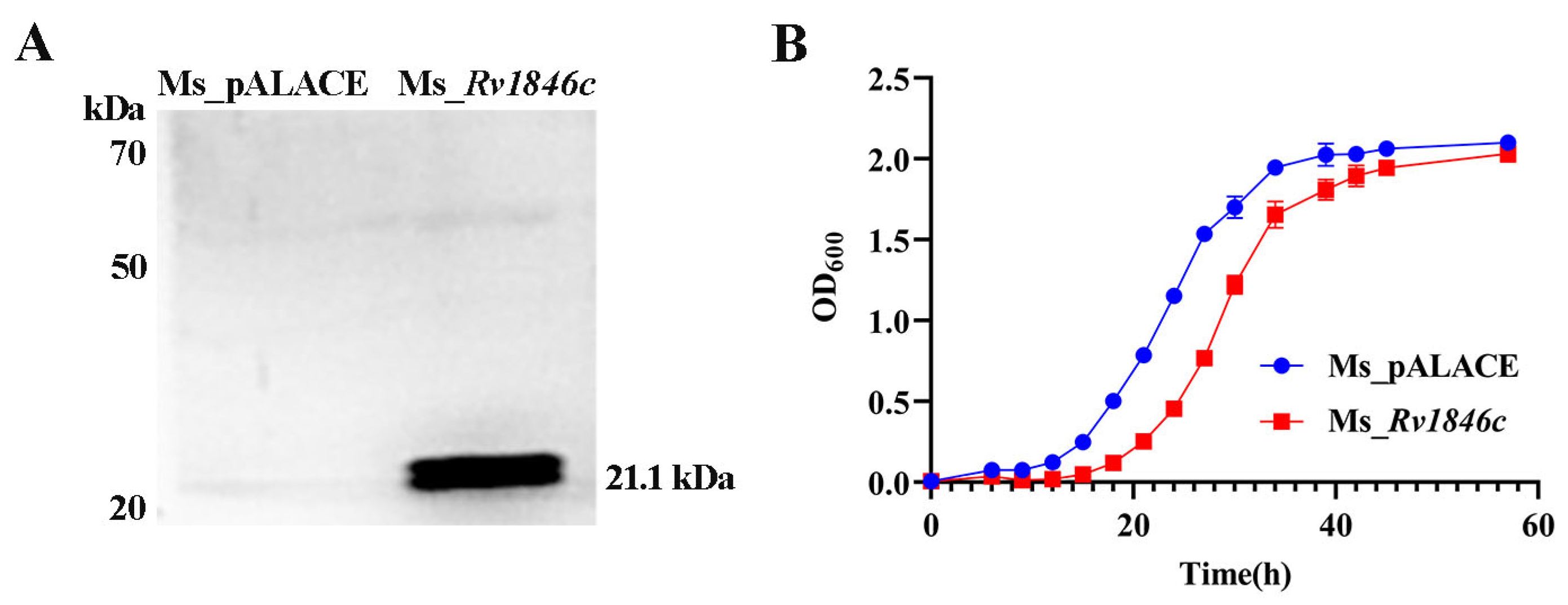 Recombinant pALACE-Rv1846c was transformed into M. smegmatis mc2155 by electroporation (2.5 kV, 25 μF, 1000 Ω) using 0.2-cm cuvettes (Bio-Rad, Hercules, CA, USA), followed by recovery in 7H9 broth (without antibiotics) at 37 °C for 2 h. Transformants were selected on 7H10 agar containing 50 μg/mL hygromycin. For protein expression validation, M. smegmatis cultures (OD600 = 0.8–1.0) were harvested and lysed by sonication (300 W, 3 s on/5 s off, 10 min) in ice-cold 1× PBS, and 100 μg of total protein was separated by 12% SDS-PAGE. Western blot analysis was performed using anti-Myc monoclonal antibody (TIANGEN, Beijing, China, Cat. MA1020) at 1:1000 dilution, followed by HRP-conjugated anti-mouse IgG (TIANGEN, Cat. SA00001-1) at 1:5000 dilution. Signals were detected using ECL Western blotting Substrate (Millipore, Burlington, MA, USA, Cat. WBKLS0500) and exposed to X-ray film for 30–60 s.