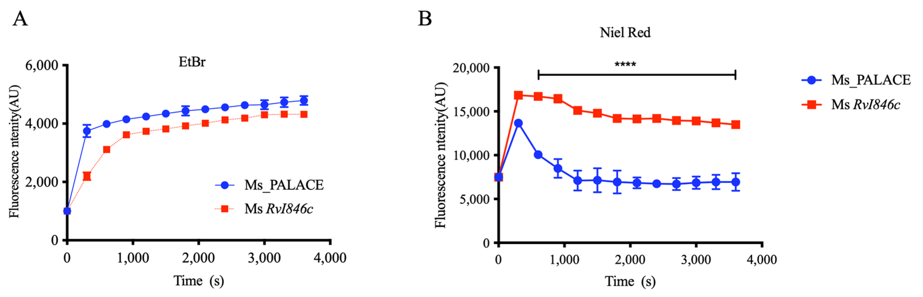 Bacteria were grown to OD600 = 0.8, harvested, washed twice with 1× PBS, and resuspended in 7H9 broth to OD600 = 0.8. An amount of 200 μL of bacterial suspension was mixed with 1 μg/mL ethidium bromide (EB; Sigma-Aldrich, Cat. E1510) or Nile red (NR; Sigma-Aldrich, Cat. 72485) in black 96-well plates with clear bottoms (Corning, Corning, NY, USA, Cat. 3603). Fluorescence was measured every 5 min for 60 min using a Tecan Spark 10M microplate reader (Männedorf, Switzerland, EB: excitation 520 nm, emission 605 nm; NR: excitation 543 nm, emission 590 nm). Plates were shaken for 10 s before each reading.