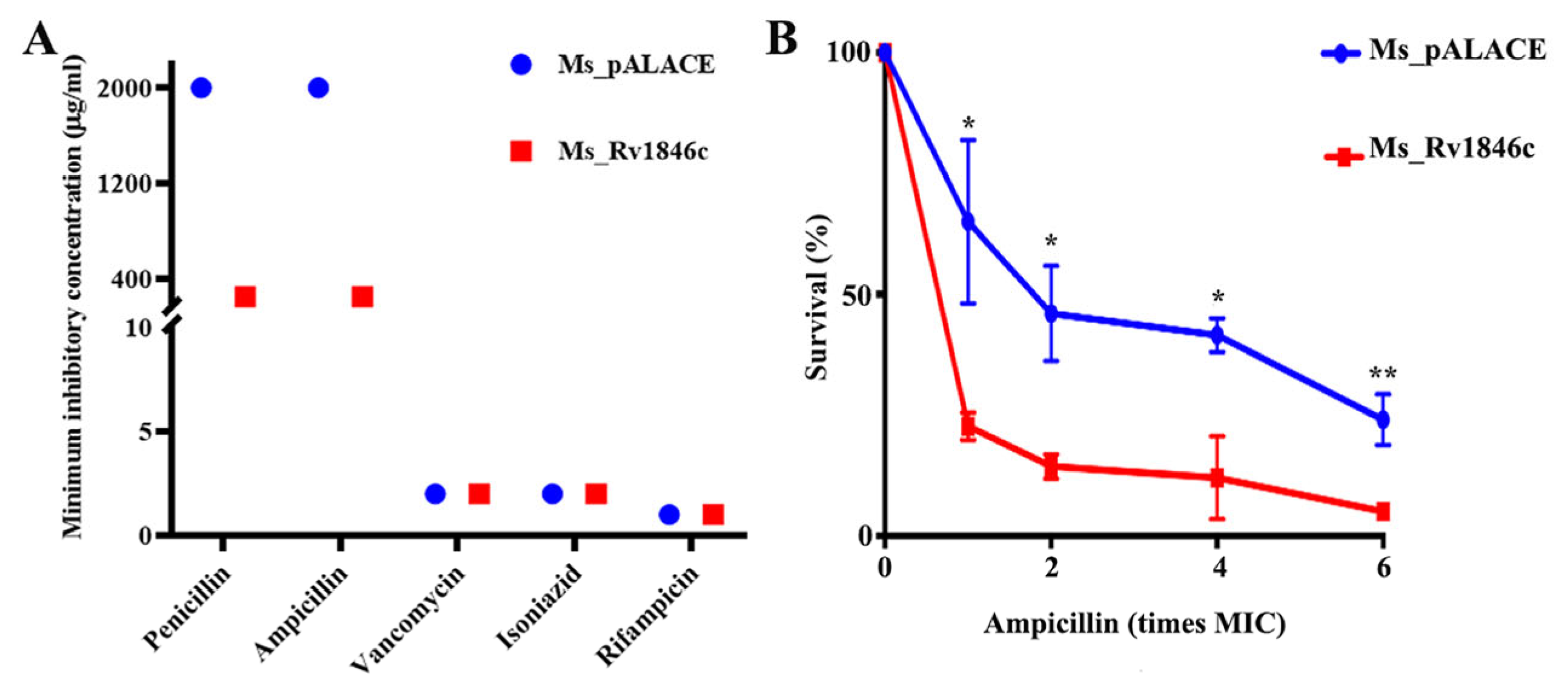 Acetamide-induced wild-type, Ms_Rv1846c (Rv1846c -overexpressing strains), and Ms_pALACE (empty plasmid strains, as negative controls) were cultured and adjusted to a uniform concentration (OD600 = 0.5). Cultures were diluted 10−5-fold and inoculated on 7H10 plates containing varying concentrations of ampicillin. Plates were incubated at 37 °C for 3–4 days, and bacterial colonies were counted. Controls without antibiotics were included. Sterile test tubes containing 7H9 liquid medium and ampicillin (two-fold serial dilutions) were prepared, inoculated with 1% bacterial culture, and incubated with shaking at 37 °C. The MIC of each antibiotic against recombinant and control bacteria was determined. Bacteria were then inoculated into medium containing antibiotics ranging from 0 to 16× MIC (1% inoculum) and incubated at 37 °C for 4 h. Cultures were plated on 7H10 plates, colonies were counted after 3 days, and survival rates were calculated. Experiments were repeated three times.