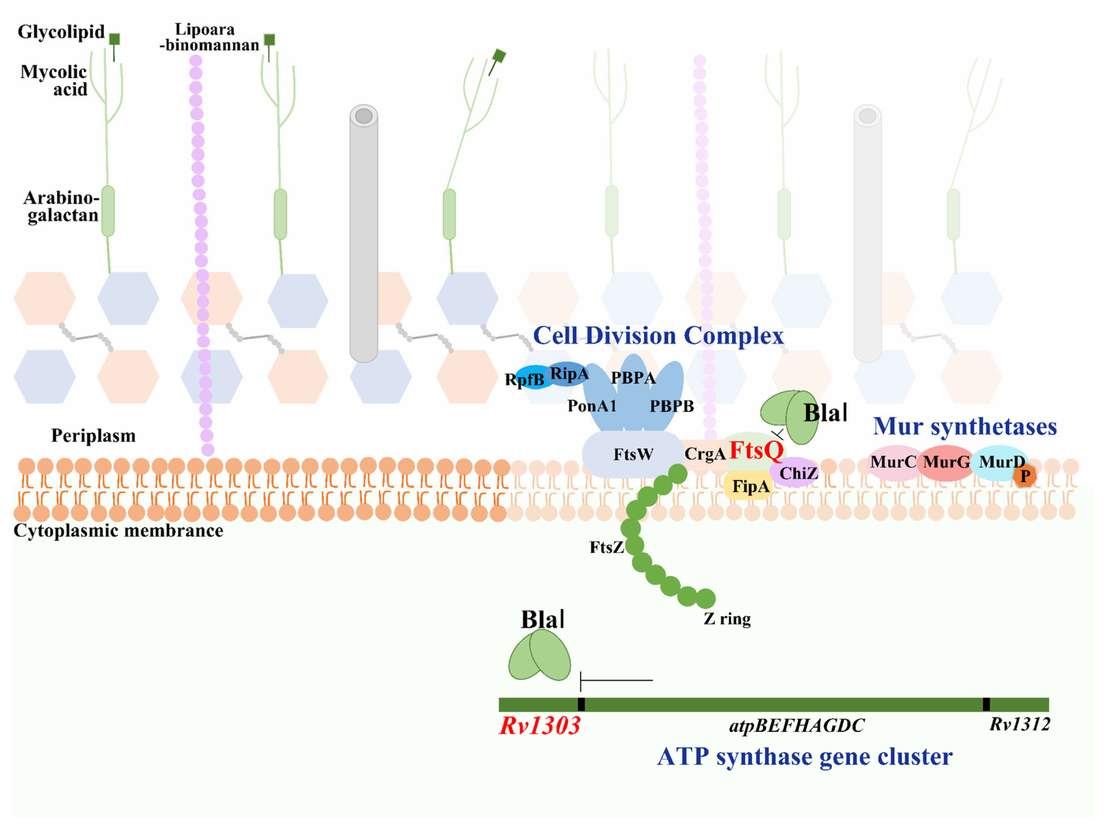 Proteins involved in cell division, including those associated with peptidoglycan synthesis, are common targets of antibiotics. Examples include FtsZ (Filamenting temperature-sensitive mutant Z), SepF (Septum-forming protein F), FtsA (Filamenting temperature-sensitive mutant A), FipA (FtsZ-interacting protein A), FtsQ (Filamenting temperature-sensitive mutant Q), FtsW (Filamenting temperature-sensitive mutant W), FtsI (Filamenting temperature-sensitive mutant I), BlaR1 (β-Lactamase Regulator 1), BlaI (β-Lactamase Inhibitor), and BlaC (β-Lactamase C), all of which play critical roles in bacterial cell division and peptidoglycan synthesis. During cell division, FtsZ, SepF, and FtsA form the “Z ring,” which constricts the cell membrane and acts as a scaffold for peptidoglycan remodeling enzymes [