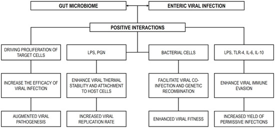 Mechanisms by which the GM positively interacts with enteric viral infections. LPS: lipopolysaccharides; PGN: peptidoglycan; TLR-4: Toll-like receptor 4.