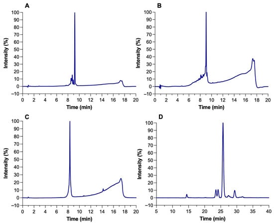 The identity and purity of microcin J25 (MccJ25), nisin Z, pediocin PA-1, and reuterin were confirmed by analytical RP-HPLC. Each compound exhibited a single dominant peak at its expected retention time with minimal impurities (Figure 1A–D). Reported retention times were consistent with published values for these compounds under similar RP-HPLC conditions [17]. Peak purity analysis confirmed that the main peaks represented >90% of total area, with nisin Z and pediocin PA-1 exceeding 95%. Reuterin, obtained through the bioconversion of 300 mM glycerol by Liml. reuteri ATCC 53608, reached a final concentration of ~200 mM with an 85% yield. The HPLC profile showed no residual glycerol, indicating efficient conversion and high product purity (Figure 1D).