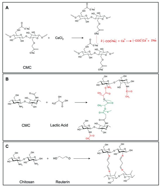 Predicted crosslinking reactions of (A) CMC with CaCl2, (B) chitosan with lactic acid, (C) chitosan with reuterin. Structures were drawn using MarvinSketch, Web version (ChemAxon Ltd., Budapest, Hungary).
