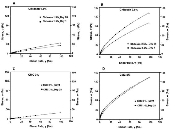 Flow curves of formulated hydrogels (A) 1.5% chitosan, (B) 2.5% chitosan, (C), 3% CMC, and (D) 5% CMC, measured on day 1 and day 28.