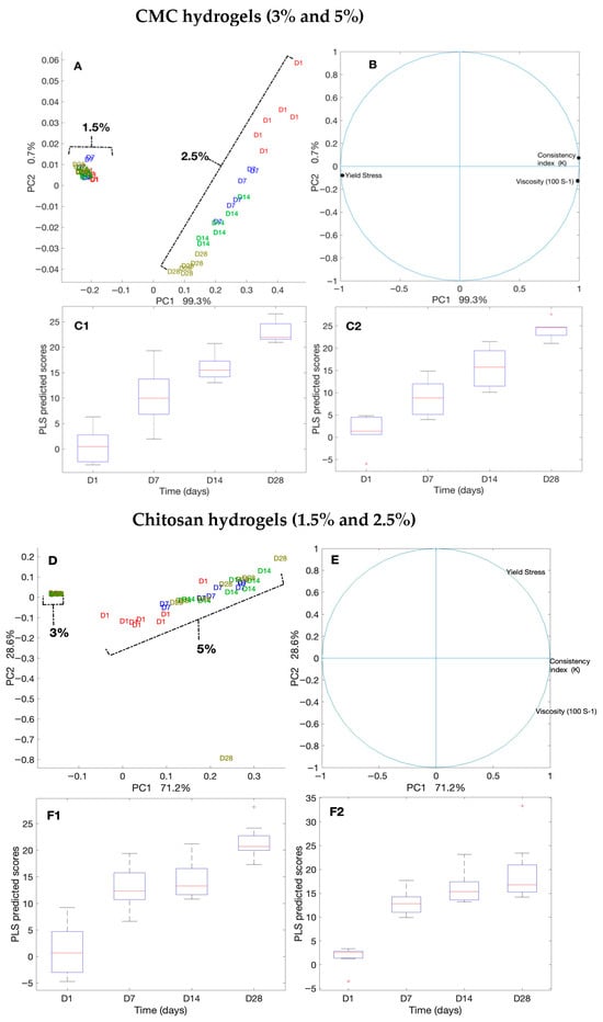 Principal component analysis (PCA) and partial least squares (PLS) regression of rheological measurements for CMC- and chitosan-based hydrogels over 28 days. (A–C2) CMC hydrogels (3% and 5%): (A) PCA score plots by polymer concentration and storage day; (B) PCA loading plots showing contributions of viscosity (100 s−1), consistency index (K), and yield stress; (C1,C2) PLS regression plots of PCA scores versus storage time. (D–F2) Chitosan hydrogels (1.5% and 2.5%): (D) PCA score plots, (E) PCA loading plots, and (F1,F2) PLS regression plots.