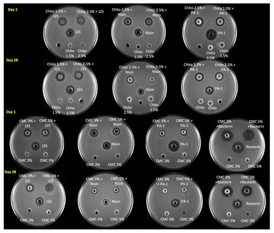 Antimicrobial activity of formulated hydrogels estimated using an agar well diffusion assay on day 1 and day 28. The antimicrobial activities of microcin J25, nisin Z, pediocin PA-1 and reuterin were tested against S. Newport ATCC 6962, S. aureus ATCC 6538, L. monocytogenes ATCC 19115 and S. Newport ATCC 6962, respectively. Control with hydrogels alone (without bacteriocins) were included on the same plate for comparison. Chito: Chitosan, J25: Microcin J25, PA-1: Pediocin.
