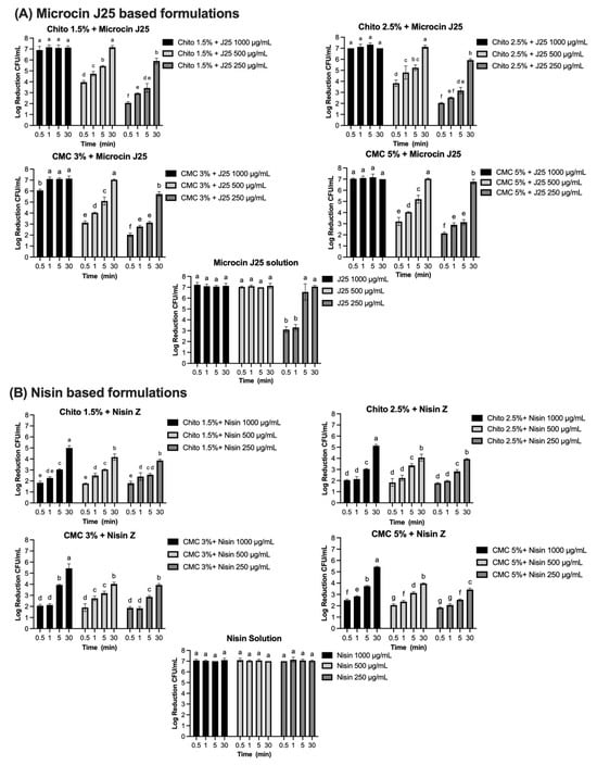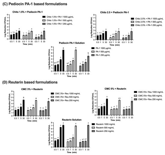 Log reduction (CFU/mL) of bacterial populations over time in solution and gel formulations containing microcin J25, nisin Z, pediocin PA-1, and reuterin. Panels: (A) Microcin J25 tested against S. Newport ATCC 6962, (B) nisin Z tested against S. aureus ATCC 6538, (C) pediocin PA-1 tested against L. monocytogenes ATCC 19115, and (D) reuterin tested against S. Newport ATCC 6962. Solutions and hydrogels (chitosan 1.5%, chitosan 2.5%, CMC 3%, and CMC 5%) were tested at three concentrations of each antimicrobial agent: 1000 µg/mL, 500 µg/mL, and 250 µg/mL for bacteriocins, and 1000 mg/mL, 500 mg/mL, and 250 mg/mL for reuterin. Time points included 0.5, 1, 5, 15, and 30 min. Bars represent mean values with error bars (standard deviations). Different superscript letters above the bars indicate statistically significant differences among treatments and time points based on two-way ANOVA followed by Tukey’s post hoc test. Treatments that share at least one letter are not significantly different (p ≥ 0.05), whereas treatments with different letters are significantly different (p < 0.05). Chito: chitosan, J25: Microcin J25, PA-1: pediocin PA-1.