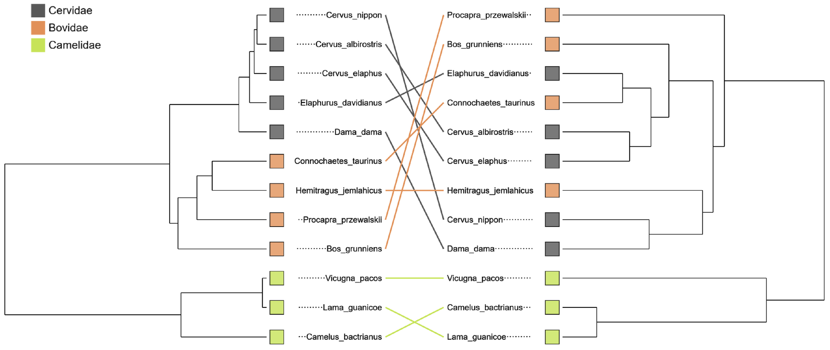 - Zurano, J.P.; Magalhães, F.M.; Asato, A.E.; Silva, G.; Bidau, C.J.; Mesquita, D.O.; Costa, G.C. Cetartiodactyla: Updating a Time-Calibrated Molecular Phylogeny. Mol. Phylogenet. Evol. 2019, 133, 256–262. [Google Scholar] [CrossRef]