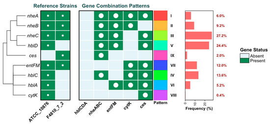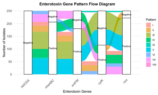 Further analysis of virulence potential, based on the number of toxin genes harboured per isolate (Toxin Score), revealed striking differences in pathogenic capacity (Figure 2). Only 2.4% of isolates carried a single toxin gene (Patterns VIII and IX), while 12% harboured two genes (Pattern VII). The majority of isolates (79.6%) carried three genes simultaneously (Patterns II–VI), representing the most dominant and epidemiologically relevant group. Notably, 6% of isolates (Pattern I) carried all four toxin genes (nheABC, entFM, cytK, and ces), underscoring the presence of highly virulent strains with broad pathogenic potential. Together, these results demonstrate that B. cereus populations in raw milk are not only genetically diverse but are also heavily skewed toward multi-toxin genotypes, which pose a greater risk to food safety and public health.