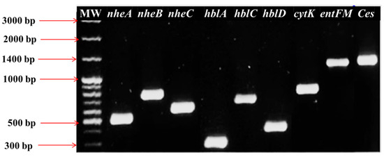 To enhance clarity and conciseness, the key primer sequences, annealing temperatures, and associated references used for the detection of B. cereus target genes, including gyrB, and genes that are associated with several virulence-associated markers, are summarized in Table 1. All primers were adopted from previously published protocols and validated using appropriate positive control strains. Specifically, B. cereus ATCC 10876 was employed as the positive control for all genes except ces, for which B. cereus F4810/72 served as the reference strain.