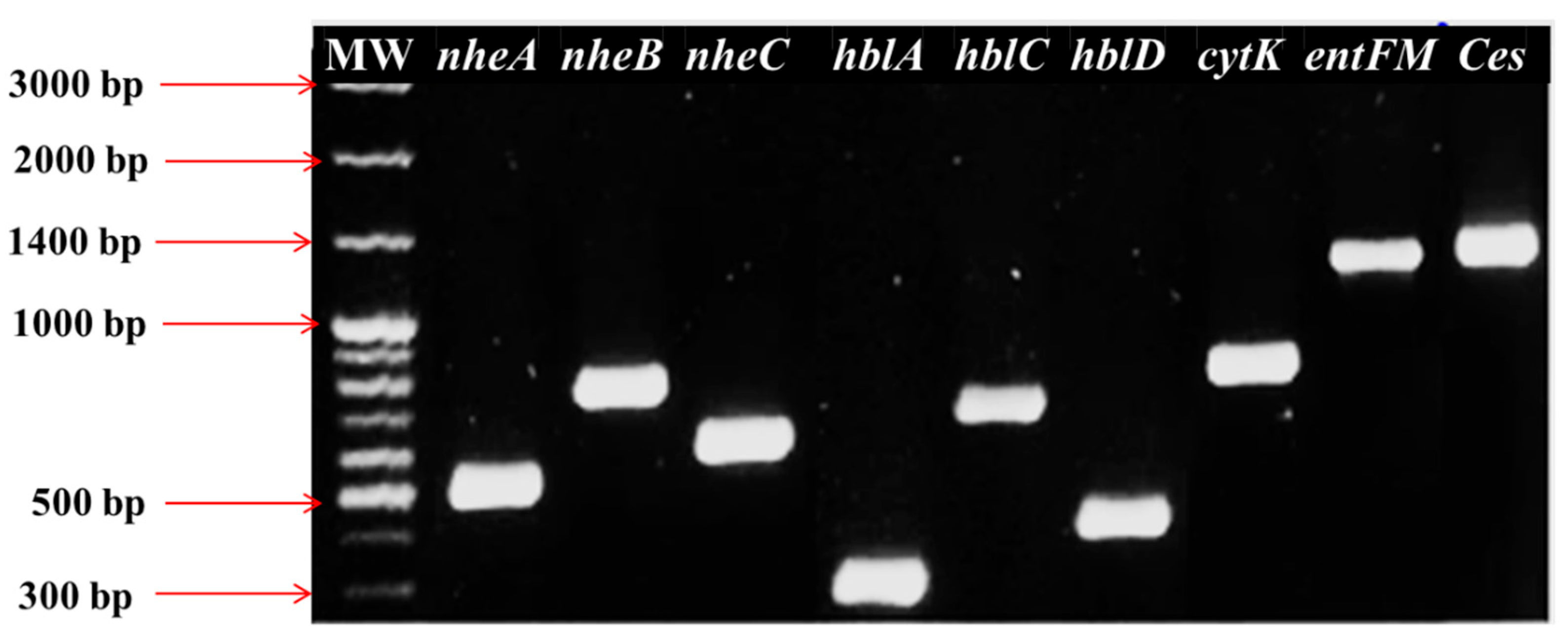 nheC | nheC forward 5′-CGGTAGTGATTGCTGGG-3′ | nheC reverse 5′-CAGCATTCGTACTTGCCAA-3′ | 53 °C | [19,26] |