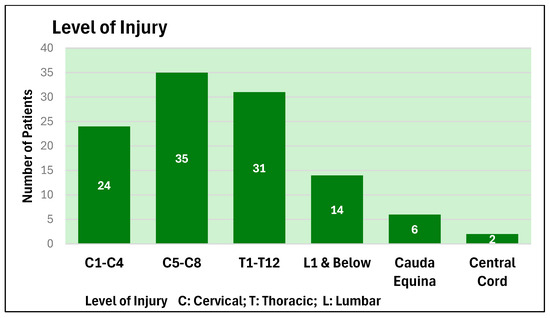 Level of injury as per spinal segments (C: Cervical; T: Thoracic; L: Lumbar) of the patients who were admitted to the spinal unit during 2024–2025.