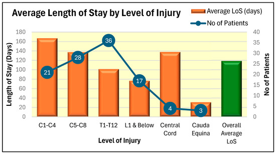 The average length of stay of patients in the spinal unit during the year 2024–2025, grouped as per the level of spinal cord injury, is shown in Figure 3.