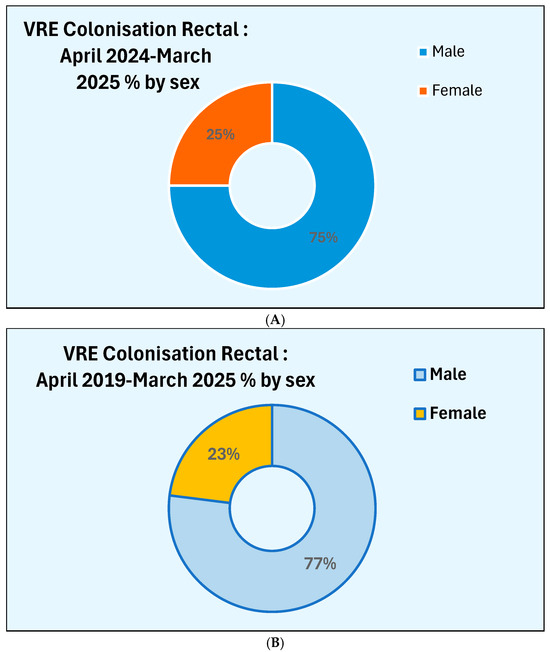 (A): Sex distribution of patients newly colonised from April 2024 to March 2025. (B): Sex distribution of patients newly colonised from April 2019 to March 2025.