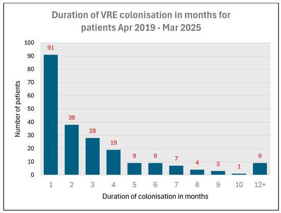 The duration of colonisation with vancomycin-resistant enterococcus varied widely. Ninety-one patients were colonised for one month whereas in nine patients, vancomycin-resistant enterococcus were positive for more than twelve months. The average length of colonisation of vancomycin-resistant enterococcus for patients over the period from April 2019 to March 2025 was 3.568 months—so rounded up, it would be 4 months (Figure 6).