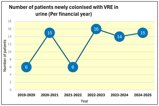 The number of patients newly colonised with VRE in urine also showed an increasing trend between 2019–2020 and 2024–2025. The number of patients who were newly colonised by vancomycin-resistant Enterococcus in urine over the last six 12-month periods from 2019 to 2020 are shown in Figure 7. Only six patients were newly colonised with vancomycin-resistant Enterococcus in urine during 2019–2020. But the number of patients who were newly colonised with vancomycin-resistant Enterococcus in urine during 2024–2025 increased 2.5-fold to 15.