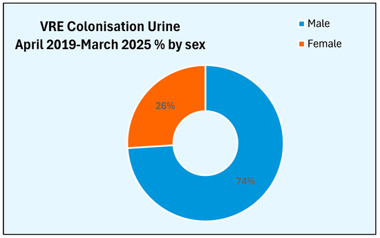 The sex distribution of patients who were colonised with VRE as detected by rectal swab with faecal matter on active screening during the six-year period from April 2019 to March 2025 is given in Figure 4B. During the six-year period also, the patients who were colonised with VRE as detected by a rectal swab containing faecal matter was 23%.