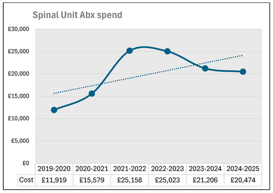 During the same period (from 2019–2020 to 2024–2025), we observed an increase in the number of patients colonised with vancomycin-resistant Enterococcus; there was an increase in the amount of money spent on antibiotics prescribed to patients in the spinal unit from £11,919 to £20,474 (Figure 9). We used the cost of antibiotics as a surrogate marker for the use of antibiotics in the patients of the spinal unit.