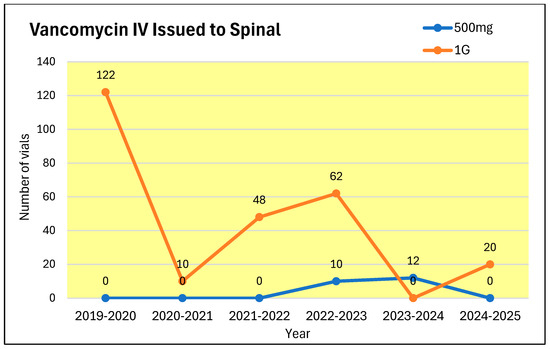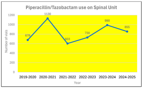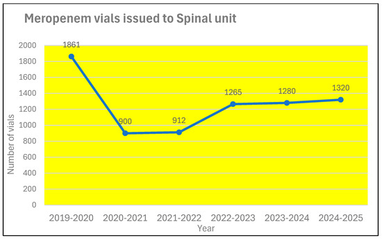 During the same period, the annual expenditure on antibiotics prescribed to patients in the spinal unit almost doubled (Figure 9) from £11,919 to £20,474. The use of piperacillin/tazobactam increased from 678 vials during 2019–2020 to 855 during 2024–2025 (Figure 10). In contrast, the prescription for meropenem decreased from 1861 vials during 2019–2020 to 1320 vials during 2024–2025 (Figure 11). The number of 1 g vials of vancomycin for intravenous use issued to spinal unit decreased from 122 during 2019–2020 to 20 during 2024–2025 (Figure 12).