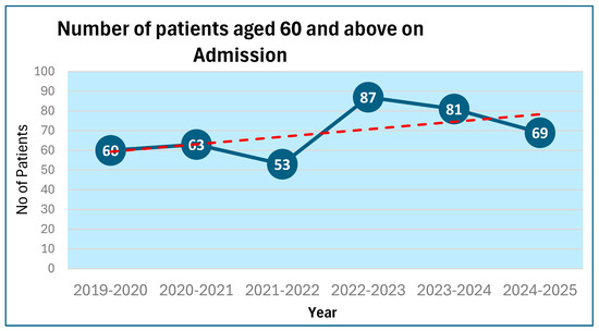 Number of patients aged 60 and above on admission. Red dashed line is the ‘trend line’ showing the trend over the last 6 years, which is an increasing number of patient aged 60 and above on admission.