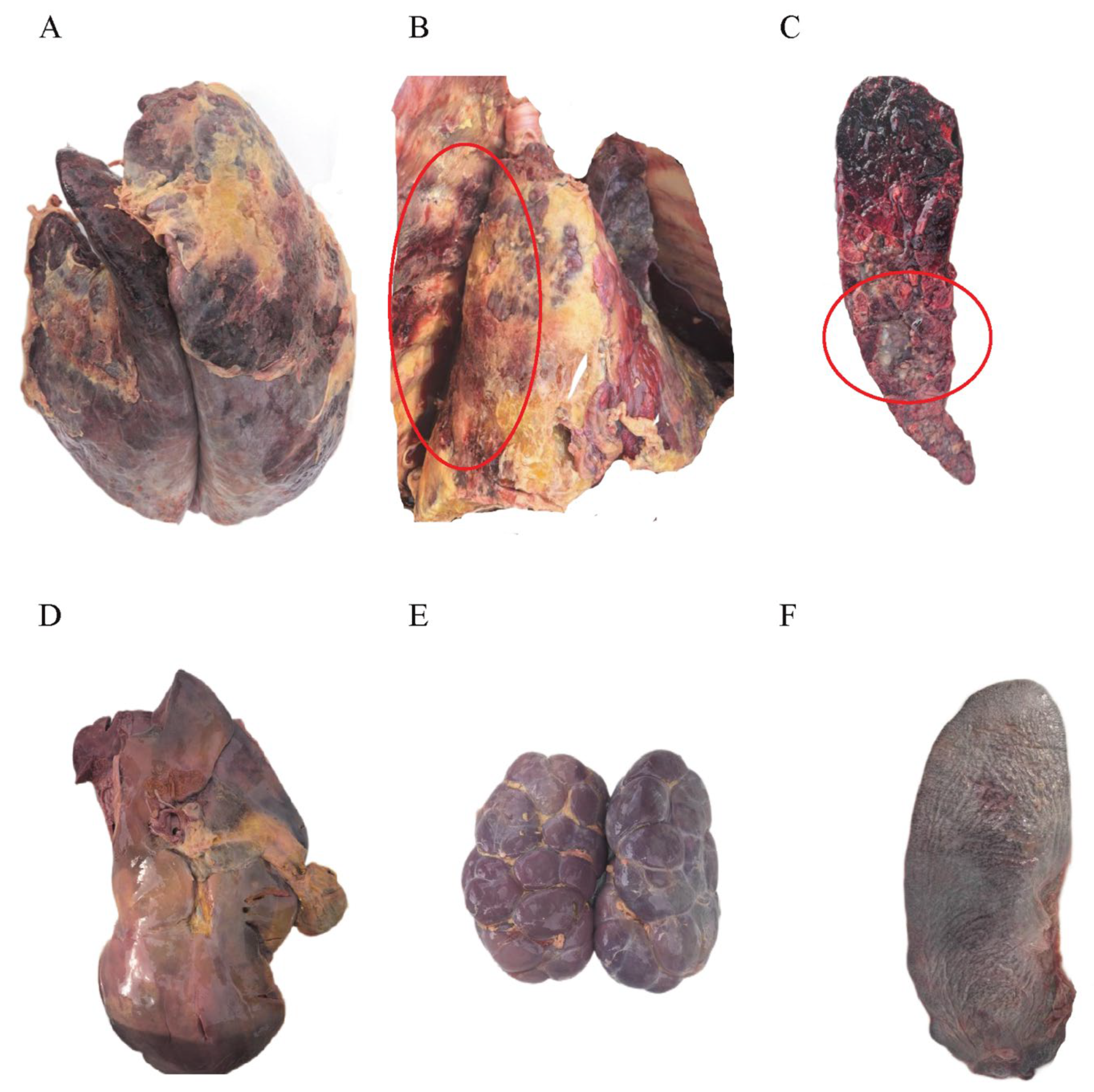 The lungs of the deceased cattle exhibited typical fibrinous pneumonia, with severe congestion and necrosis of the lung tissue (Figure 2A) and adhesions (Figure 2B). Upon sectioning the lungs, a large amount of caseous necrosis was observed (Figure 2C). The liver showed severe congestion and edema, appearing dark red (congested) with some areas being soft in texture (necrotic) (Figure 2D). The spleen and kidneys were markedly enlarged, congested, and necrotic (Figure 2E,F).