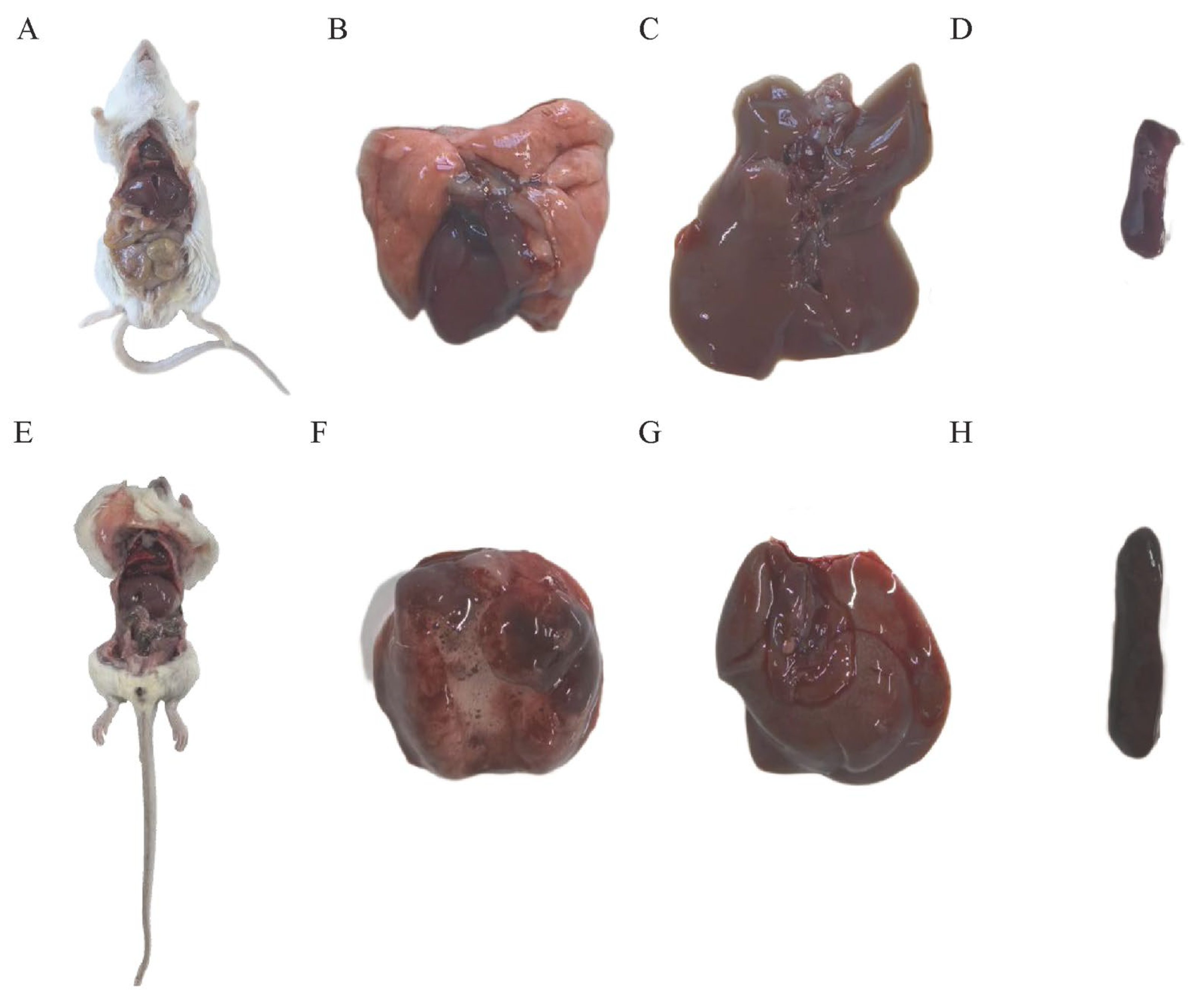 To investigate the virulence of the Mannheimia haemolytica strain XJCJMh1, we conducted an infection experiment in mice using an inoculum dose of 1.5 × 108 cfu/mL. The results showed significant differences in physiological responses between the experimental and control groups 4 h post-inoculation. Mice in the control group exhibited no abnormal symptoms, whereas those in the experimental group began to show signs of depression, anorexia, reduced activity, huddling, and somnolence 4 h after infection with Mannheimia haemolytica. Some mice also experienced tremors. After 6 h, rapid breathing and mortality were observed in the experimental group. We immediately performed autopsies on the deceased mice and found varying degrees of pathological changes in the organs of the infected mice. Specifically, the lungs of control mice appeared normal (Figure 3B), while those of the infected mice showed congestion, edema, and pleural adhesions (Figure 3E,F). Additionally, the spleens and livers of the infected mice were mildly enlarged (Figure 3G,H). Bacterial liquid PCR identification confirmed the infection in all mice, as indicated by consistent electrophoresis band sizes (Figure S1).