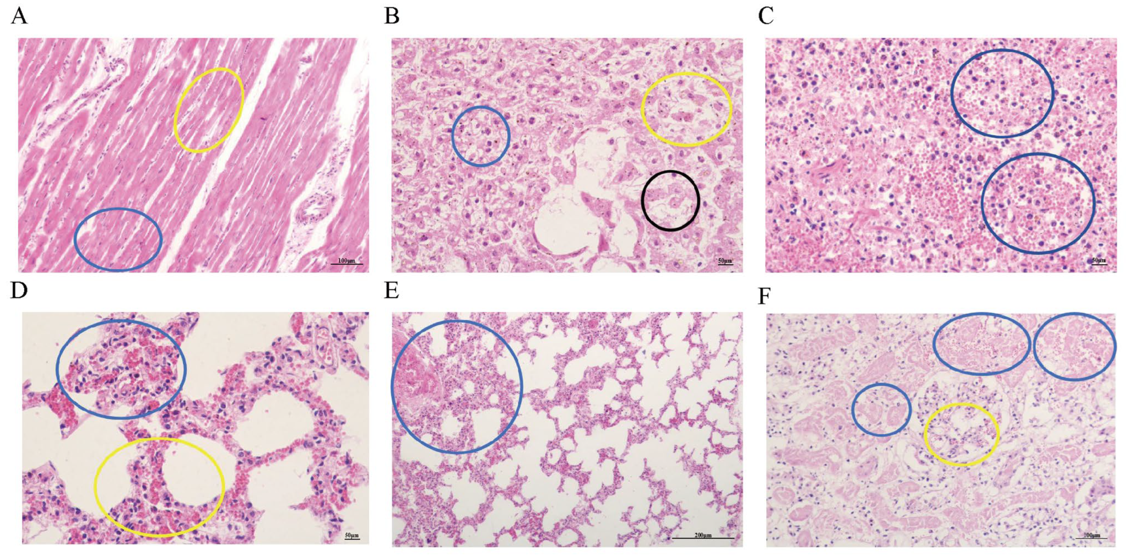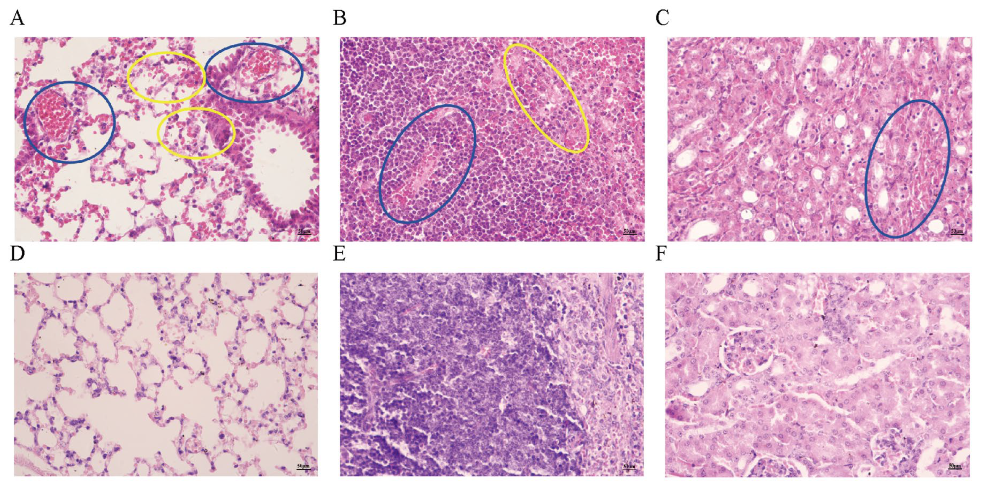 Severe congestion in the lungs of infected mice is visible (as indicated by the blue circle in Figure 5A), along with a small amount of hemorrhage (as indicated by the yellow circle in Figure 5A). The spleen shows severe hemorrhage (as indicated by the blue circle in Figure 5B) and a small amount of cellular necrosis (as indicated by the yellow circle in Figure 5B). The renal interstitium exhibits severe hemorrhage (as indicated by the blue circle in Figure 5C).