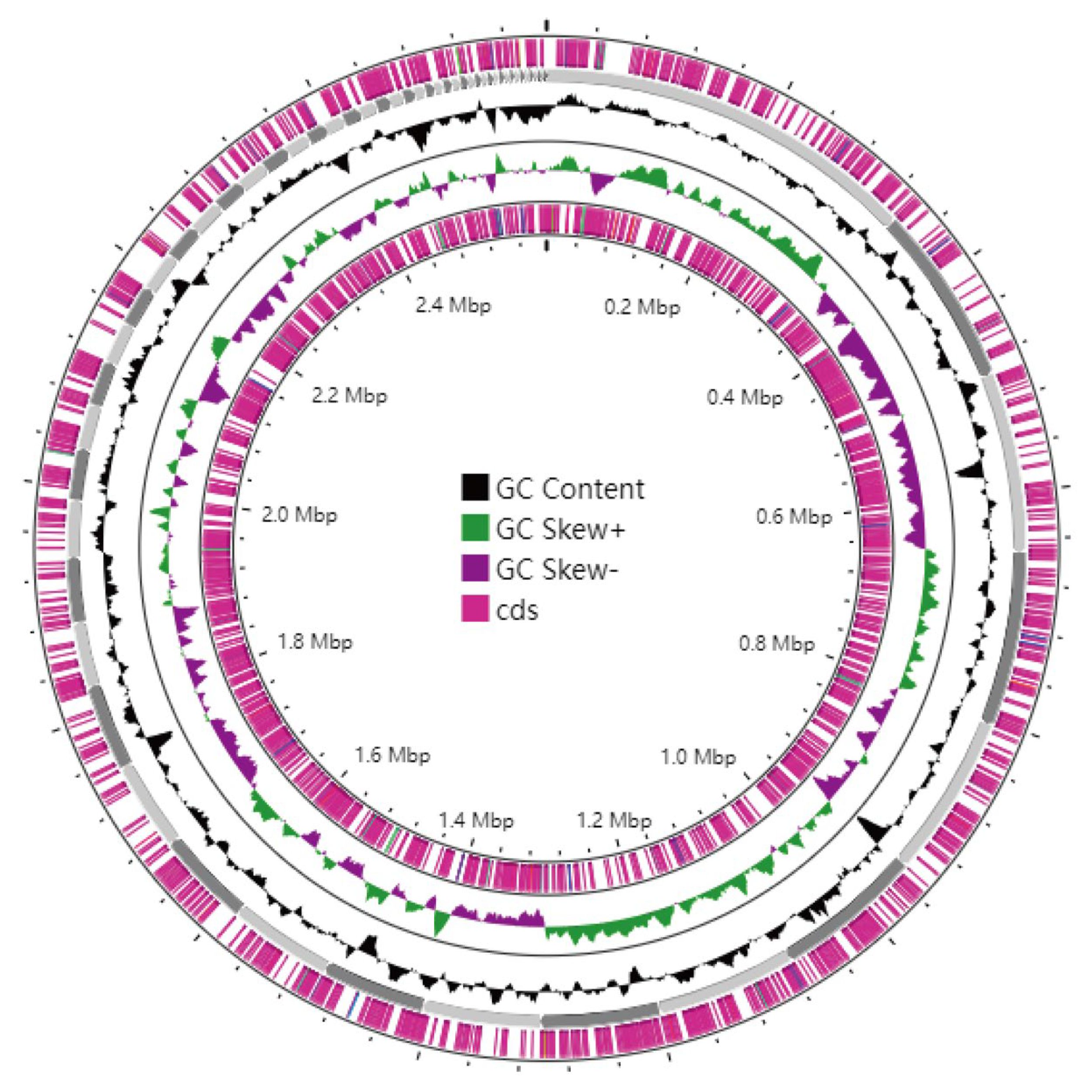 The genome of strain XJCJMh1 was assembled de novo, and the scaffold information has been deposited in GenBank under accession number SUB15374783. The assembly consists of 58 scaffolds with a total length of 2,595,489 bp (2.60 Mb). The longest scaffold is 336,678 bp, and the shortest is 1953 bp. The N50 is 104,215 bp, and the N90 is 23,753 bp. The G + C content of the genome is 40.93%. A total of 2644 coding genes were predicted, with coding regions accounting for 88.22% of the total genome length. The visualization of the genome assembly is shown in Figure 6. In addition to the coding genes, the genome contains 157 tandem repeat sequences, 362 dispersed repeat sequences, 82 non-coding RNAs, 3 genomic islands, 20 prophages, and 20 CRISPR sequences. The overall results of the genome components are summarized in Table 2