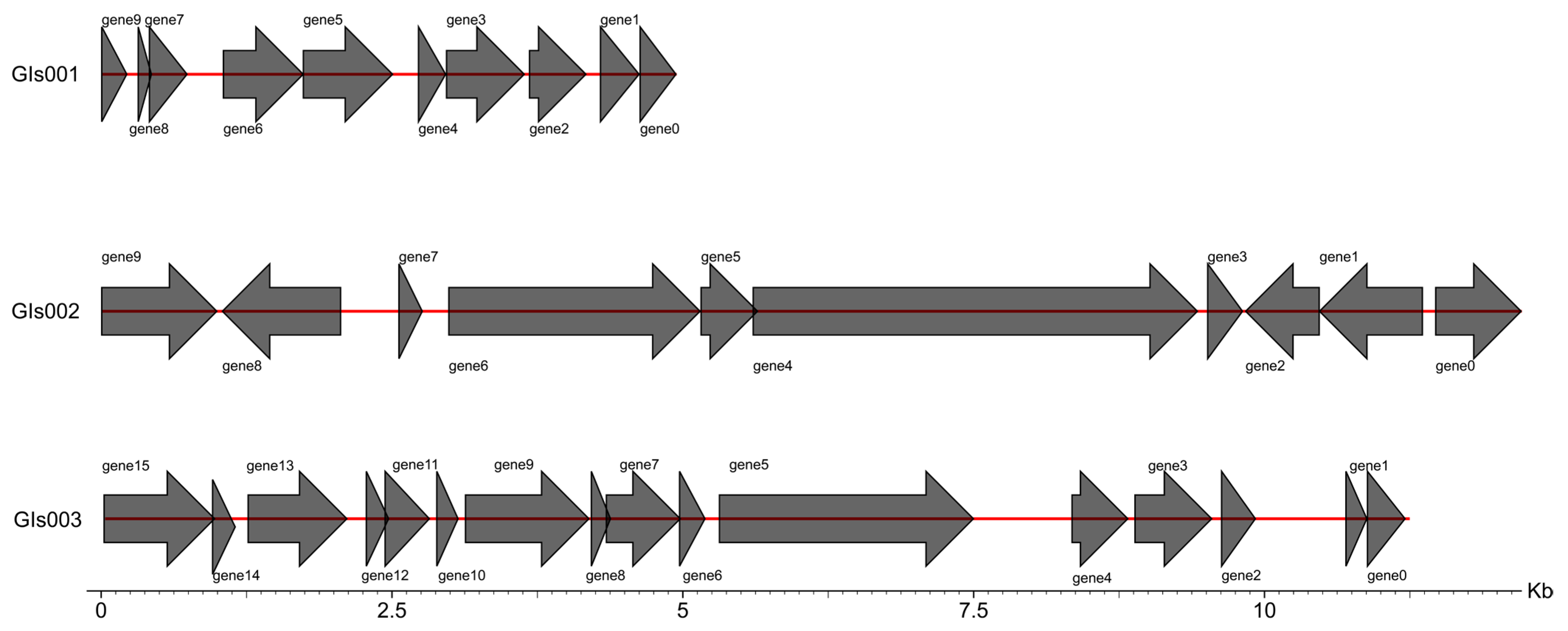 Genomic islands are segments of DNA that have been integrated into the microbial genome through horizontal gene transfer, often originating from bacteria, phages, or plasmids. These islands can be associated with various biological functions, including pathogenic mechanisms and host adaptation. In the genome of strain XJCJMh1, three genomic islands were predicted: Gls001, Gls002, and Gls003. The total length of these islands is 28,042 bp, as shown in Figure 7.