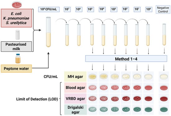 To determine the detection limits, a dilution series of spiked samples was prepared, ranging from 108 to 100 CFU/mL. The diluted samples were cultured on various agar media: Müller–Hinton agar (Becton Dickinson GmbH, Heidelberg, Germany), Columbia blood agar (Becton Dickinson GmbH, Heidelberg, Germany), Drigalski lactose agar (Becton Dickinson GmbH, Heidelberg, Germany), and Violet Red Bile Dextrose (VRBD) agar (Merck, Darmstadt, Germany), to assess the colony counts and establish the limit of detection, defined as the lowest bacterial concentration at which colony growth was still observed. Of the media used, Müller–Hinton and Columbia blood agar are non-selective, Drigalski lactose agar is selective for Gram-negative bacteria, and VRBD agar is both selective and differential for Enterobacteriaceae. As part of each experimental run, negative controls consisting of uninoculated culture media and pasteurised donor milk were included in parallel with each biological and technical replicate to confirm sterility and exclude contamination. The experimental setup for the dilution series and agar plate inoculation is shown in Figure 1, illustrating the procedures for determining the detection thresholds.